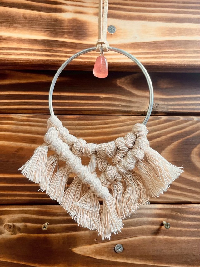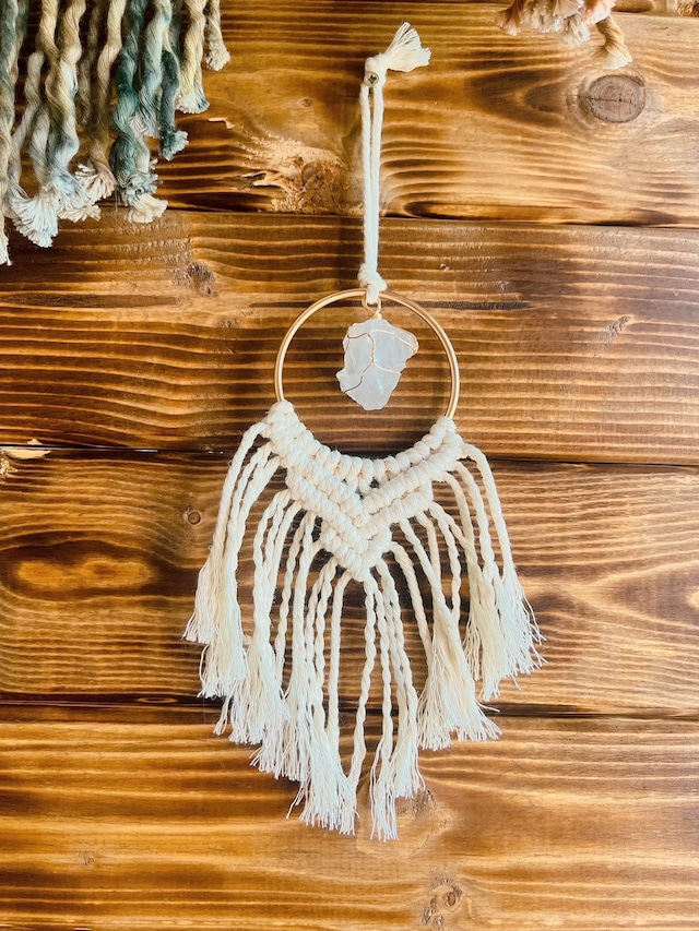 Spirits Charm* Mini Tapestry – Suncatcher 糸の陰影とサンキャッチャーの質感が静かに際立つ、 小さなタペストリーです。 空間の片隅や、窓辺や車内、旅の持ち物としてなど、 日常の空間にそっと添える“静かなアクセント”として制作しました。 中心にはサンキャッチャーを組み合わせています。 サンキャッチャーは「虹を生み出すことで、幸せを運ぶ」と言われ、太陽の当たる窓辺に置くとキラキラと光を取り入れてくれます。 同じ形はなく、一点ものとなります。 ◆ SIZE 直径6×全長17cm前後+チェーン約25cm ◆COLOR アイボリー ◆STONE サンキャッチャー 色違い・石違いも出品しています。 一覧ページよりご覧いただけます。 ▼すべてのミニタペストリーはこちらから https://rutilus.official.ec/categories/7075933 ------------------------------------ 「手のひらサイズの物語」 Spirits Charmは、 身につけるもの、空間に添えるものを通して、 日常に小さな余白をつくるシリーズです。 意味を決めすぎず、 色や形、結びの感触で選ぶこと。 その人の時間の中で、 自然と役割が生まれていく存在であってほしいと考えています。 Spirits Charm一覧はこちら↓ https://rutilus.official.ec/categories/7075921
