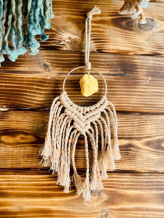 Spirits Charm* Mini Tapestry – YellowAventurine 糸の陰影とイエローアベンチュリンの質感が静かに際立つ、 小さなタペストリーです。 空間の片隅や、窓辺や車内、旅の持ち物としてなど、 日常の空間にそっと添える“静かなアクセント”として制作しました。 中心にはイエローアベンチュリンを組み合わせています。 重たすぎず軽すぎない、ほどよい温度感を持った石がさりげなく引き立つデザインです。 同じ石の形はなく、一点ものとなります。 ◆ SIZE 直径7×全長18cm前後(掛け紐除く) ◆COLOR ジュートブラウン ◆STONE イエローアベンチュリン 色違い・石違いも出品しています。 一覧ページよりご覧いただけます。 ▼すべてのミニタペストリーはこちらから https://rutilus.official.ec/categories/7075933 ------------------------------------ 「手のひらサイズの物語」 Spirits Charmは、 身につけるもの、空間に添えるものを通して、 日常に小さな余白をつくるシリーズです。 意味を決めすぎず、 色や形、結びの感触で選ぶこと。 その人の時間の中で、 自然と役割が生まれていく存在であってほしいと考えています。 Spirits Charm一覧はこちら↓ https://rutilus.official.ec/categories/7075921