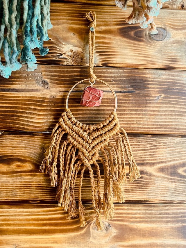 Spirits Charm* Mini Tapestry – RedJasper 糸の陰影とレッドジャスパーの質感が静かに際立つ、 小さなタペストリーです。 空間の片隅や、窓辺や車内、旅の持ち物としてなど、 日常の空間にそっと添える“静かなアクセント”として制作しました。 中心にはレッドジャスパーを組み合わせています。 落ち着いたトーンで、どこか土の気配を思わせる石がさりげなく引き立つデザインです。 同じ石の形はなく、一点ものとなります。 ◆ SIZE 直径7×全長18cm前後(掛け紐除く) ◆COLOR キャメル ◆STONE レッドジャスパー 色違い・石違いも出品しています。 一覧ページよりご覧いただけます。 ▼すべてのミニタペストリーはこちらから https://rutilus.official.ec/categories/7075933 ------------------------------------ 「手のひらサイズの物語」 Spirits Charmは、 身につけるもの、空間に添えるものを通して、 日常に小さな余白をつくるシリーズです。 意味を決めすぎず、 色や形、結びの感触で選ぶこと。 その人の時間の中で、 自然と役割が生まれていく存在であってほしいと考えています。 Spirits Charm一覧はこちら↓ https://rutilus.official.ec/categories/7075921