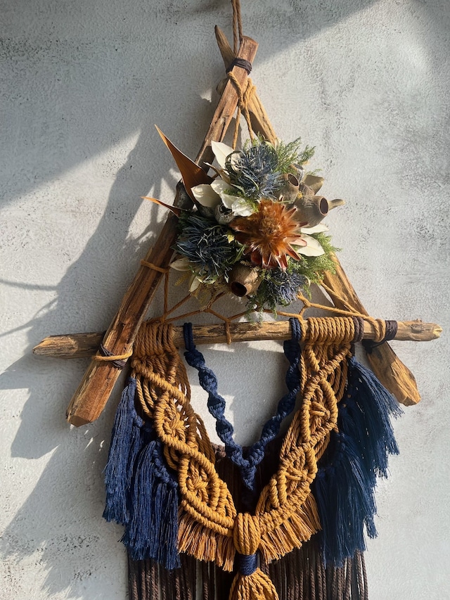 【Y’s Garden collaboration series】 ドライフラワーを合わせた、 マクラメドリームキャッチャーです。 ネイティブの空気感をまとったドライフラワーに、 流木をベースとしたドリームキャッチャーと ボリュームのあるマクラメを組み合わせました。 ポイントで入る色味が、 シンプルな構成の中にほどよいアクセントを与え、 空間に印象的な存在感をもたらします。 ネイティブテイストの空間にはもちろん、 落ち着いたインテリアやシンプルなお部屋にも 自然に馴染む一点です。 ◆SIZE:全長 約73cm(かけ紐除く) 直径 約34cm / 厚さ 約10cm弱 ◆COLOR:navy / camel / darkbrown ◆使用花材(Y’s Garden様) ・リュウカデンドロンスターコーン ・エリンジューム ・バンクシアの葉 ・ユーカリトランペット ・ヒカゲノカズラ ・グレビレアゴールド ・百合ガラ(漂白) 地元・湘南のマルシェで出会った Y’s Garden様。 作品の世界観とお人柄に惹かれ、 時間をかけて形にしたコラボレーション作品です。 ▼Y's Garden様 https://www.instagram.com/y.s.garden0308?igsh=MXViYm55OXk0ajJyNw== ※なるべく実物に近い色味で撮影していますが、 ご覧のデバイスにより印象が異なる場合がございます。 ※ドライフラワーの状態により、同じ花材または似たものに差し替える場合があります。写真とは若干異なる場合がございますので、予めご了承のうえお問い合わせくださいませ。 同シリーズはこちら↓ https://rutilus.official.ec/categories/7092242