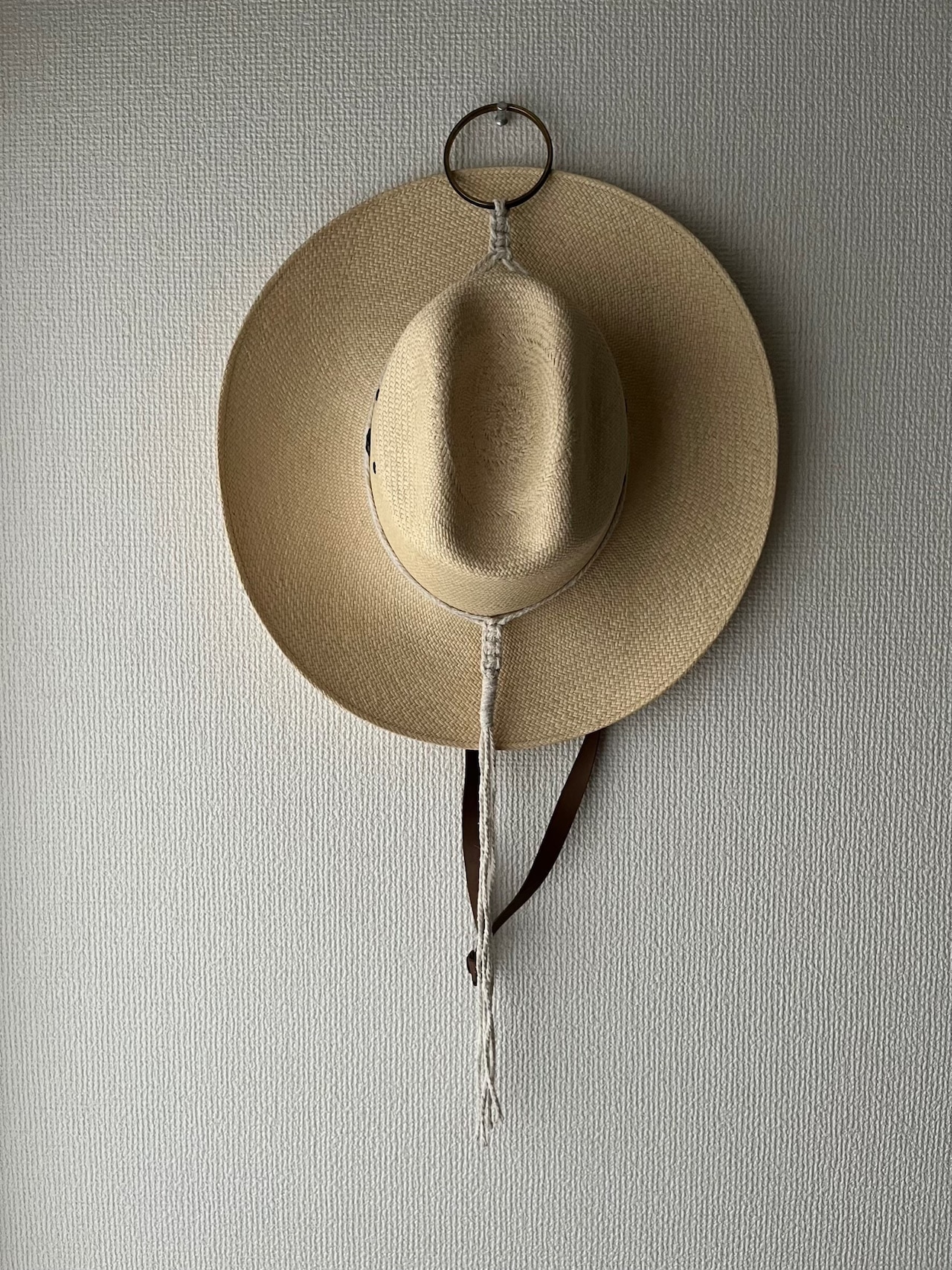 ベトナム製バッファローホーンのリングをフック部分に使用した、シンプルな壁掛けハットハンガーです。
